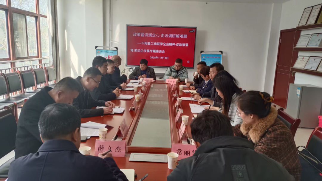 为深入学习贯彻党的二十届四中全会精神,推动《中华人民共和国民营经济促进法》落地见效,11月18日,千阳县工商联组织开展“政策宣讲润企心、走访调研解难题”专项活动,并召开座谈会。县委常委、统战部部长张晓军出席会议并讲话,县发改局、财政局、工信局等部门负责人及9位民营企业代表参加。