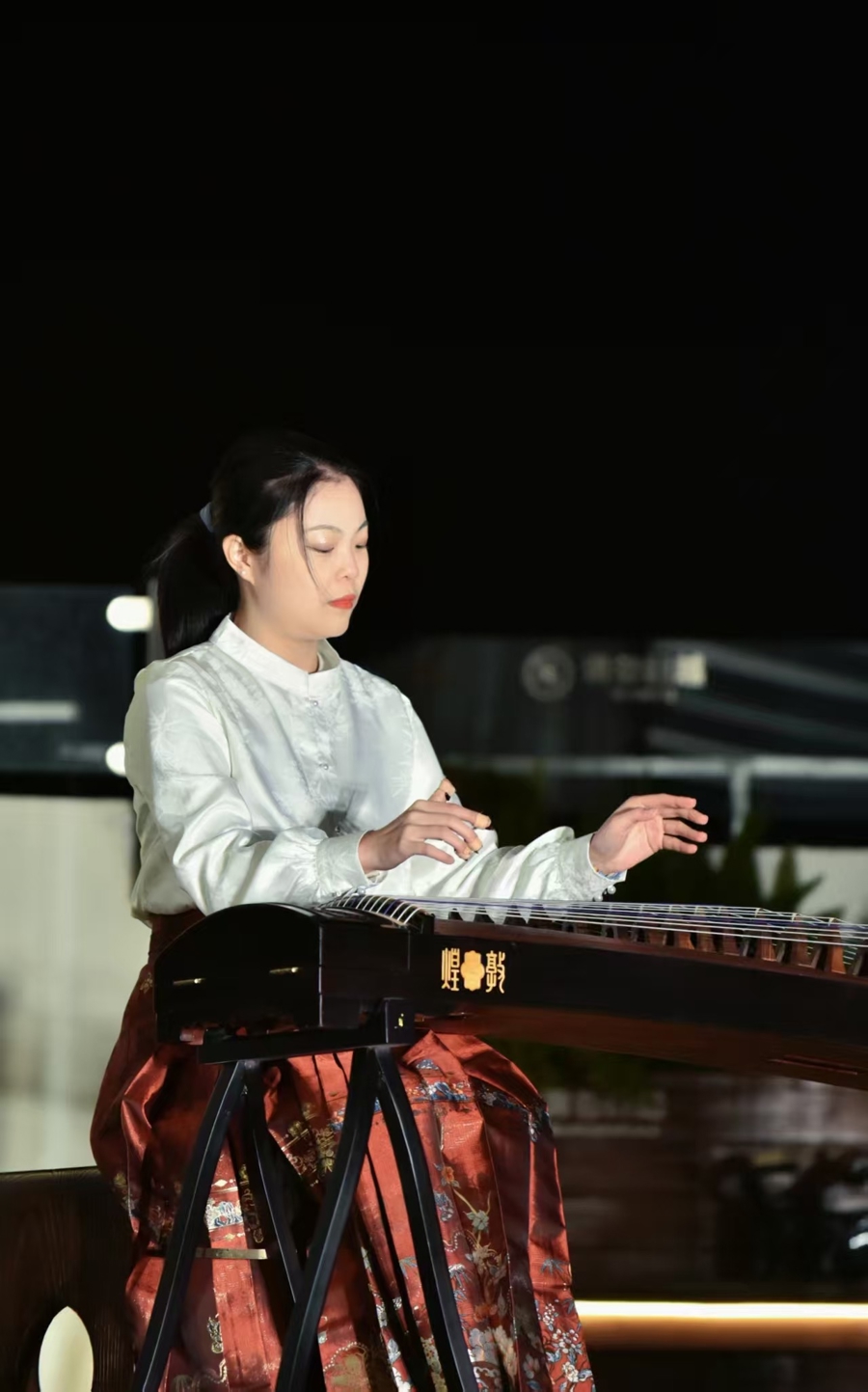 音乐成为诗歌的翅膀。古琴演奏家王鹏领衔,笛箫演奏家潘天行、琵琶演奏家沈美含、古筝演奏家田易敏等沪上优秀青年演奏家组成的古典乐团队,穿插演奏了《春江花月夜》《梅花三弄》《渔舟唱晚》《良宵引》等经典曲目。