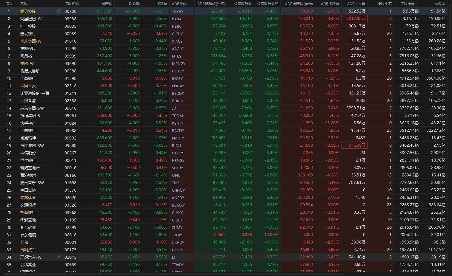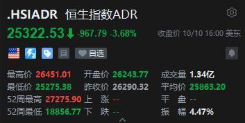 智通财经APP获悉,周五美股三大指数悉数下跌。恒生指数ADR下跌配资门户一家天下,按比例计算,收报25322.53点,较香港收市跌967.79点或3.68%。